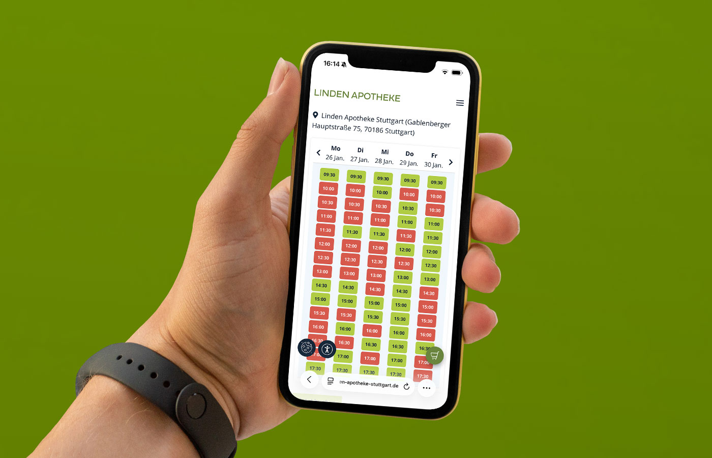 Das Buchungstool entlastet beide Seiten. Kundinnen und Kunden wählen ihren Termin flexibel und jederzeit aus, die Apotheke behält den Überblick und spart wertvolle Zeit im Tagesgeschäft. Übersichtlich, planbar, stressfrei.