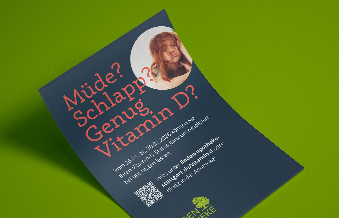 Für die Linden Apotheke Stuttgart durften wir zeigen, wie Print-to-Web einfach, verständlich und schlüssig funktionieren kann. Plakative Poster und ein kompakter Info-Flyer machen vor Ort aufmerksam und führen Interessierte per Link oder QR-Code auf eine Infoseite mit weiterführenden Informationen und direkter Online-Terminbuchung. Kein Suchen, kein Nachfragen – einmal scannen reicht.